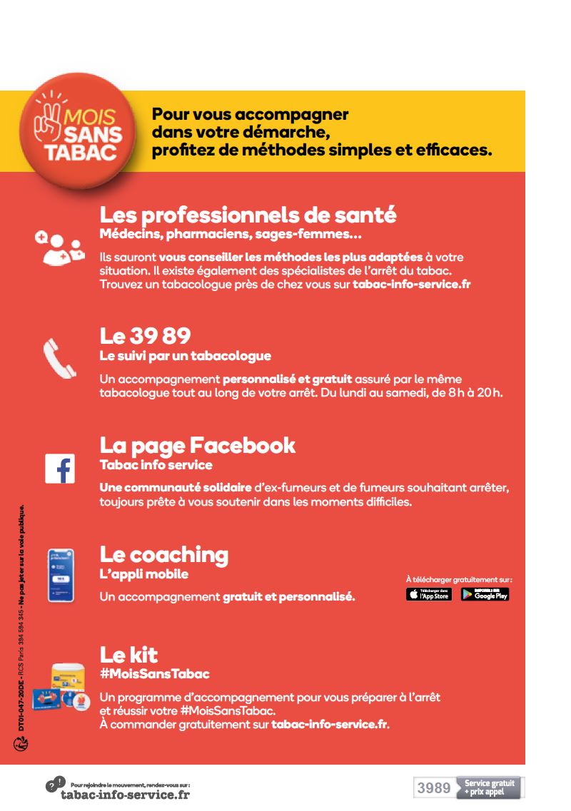 N’hésitez pas à parler de votre projet d’arrêter de fumer à des professionnels de santé et profitez de conseils et d’outils gratuits pour vous donner toutes les chances d’y arriver sur https://www.tabac-info-service.fr/