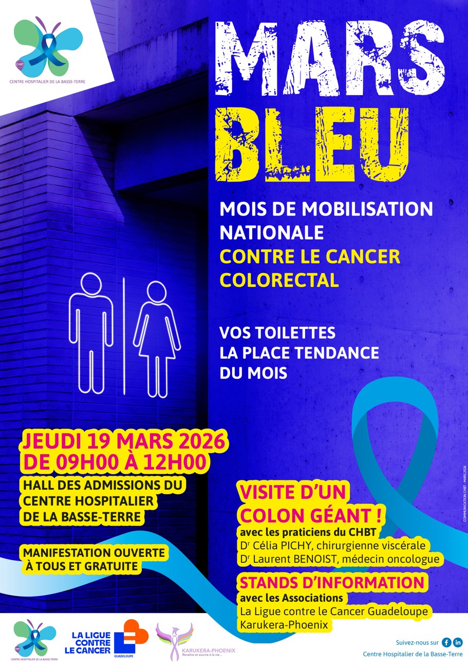 Le CHBT et les Associations La Ligue contre le Cancer – comité Guadeloupe et Karukera-Phoenix vous donnent rendez-vous le jeudi 19 mars 2026 de 9h à 12h dans le hall des admissions pour une manifestation ludique autour du cancer colorectal.